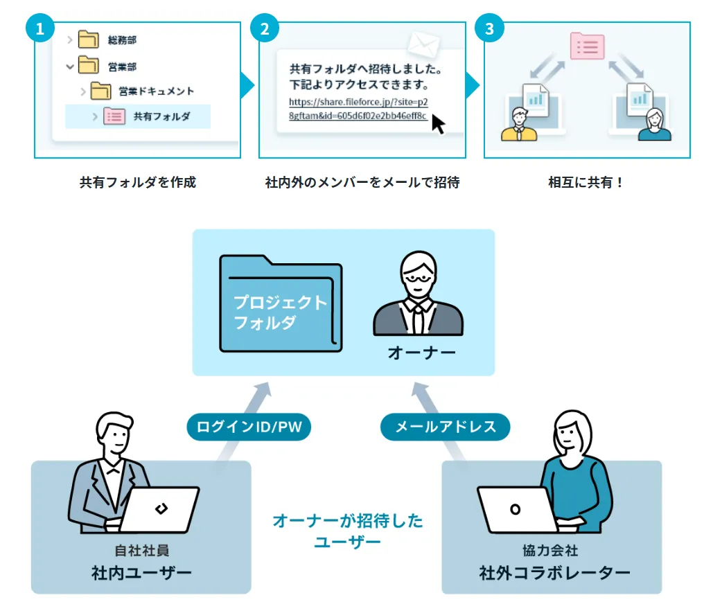 ※社内外とのファイル授受が可能なプロジェクトフォルダ機能(イメージ図)Fileforce導入で、各支社間での連携がスムーズに