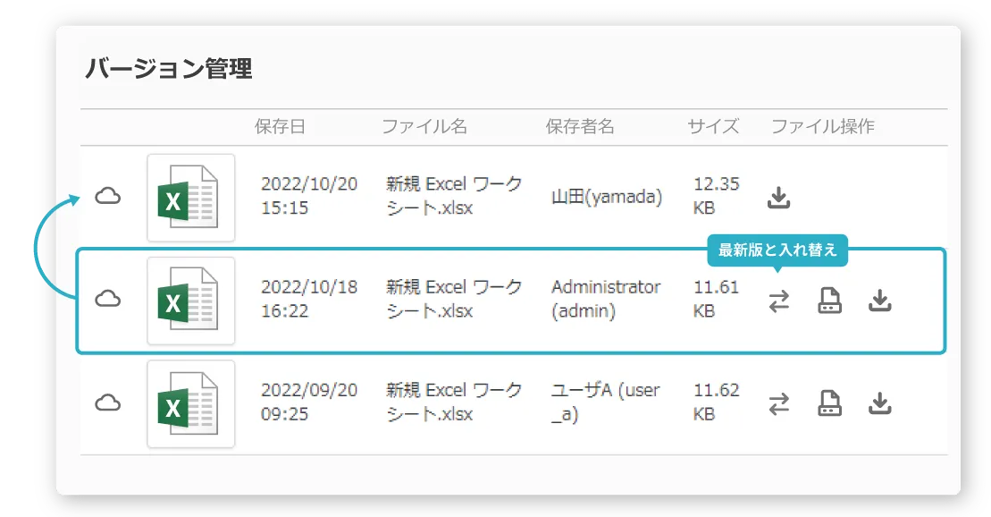 大石氏: ファイル単位で世代管理をしているバージョンファイル機能も画面が分かりやすく助かっています。世代数は無制限で保存期間が60日間あり、保存ミスの際や別名保存などした際に、直感的なボタンで簡単に操作できるのは、いざという際に重宝しています。