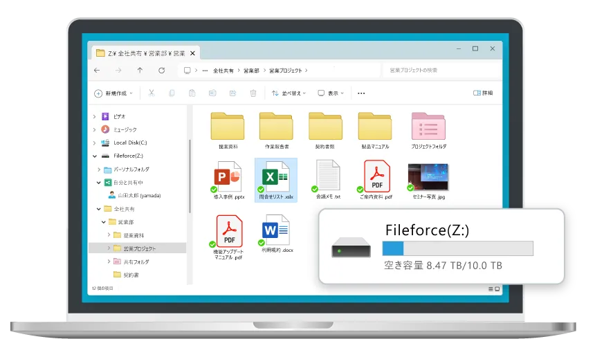 従来のファイルサーバーと同等にネットワークドライブにマウント利用可能なFileforce Drive:https://www.fileforce.jp/functions/functions-ui/#anchor-h_1