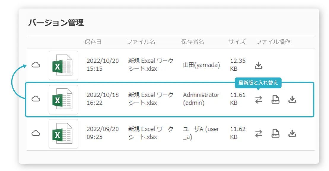※ファイル単位で世代管理をしているバージョンファイル機能