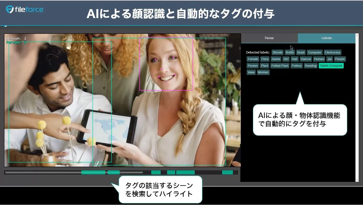 今年は「大容量データの共有から管理まで実現する スマートなストレージサービス Fileforce」をテーマに、高画質動画のような大容量ファイルを日常業務からアーカイブ、保管までの多様な業務シーンで一貫して利用できるサービスとして、高セキュアで業務上のタイムロスを発生させない様々な技術と工夫をご紹介しました。また、ユーザーはもちろん管理者にもわかりやすいインターフェースと今回の展示会向けに準備をしたAIを活用した画像認識による優れた動画プレビューと検索機能について、コンセプトデモとしてご覧いただきました。