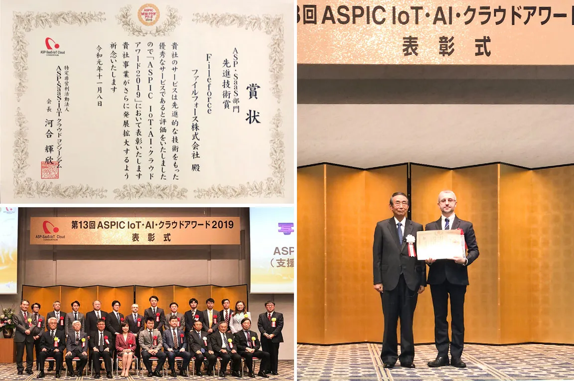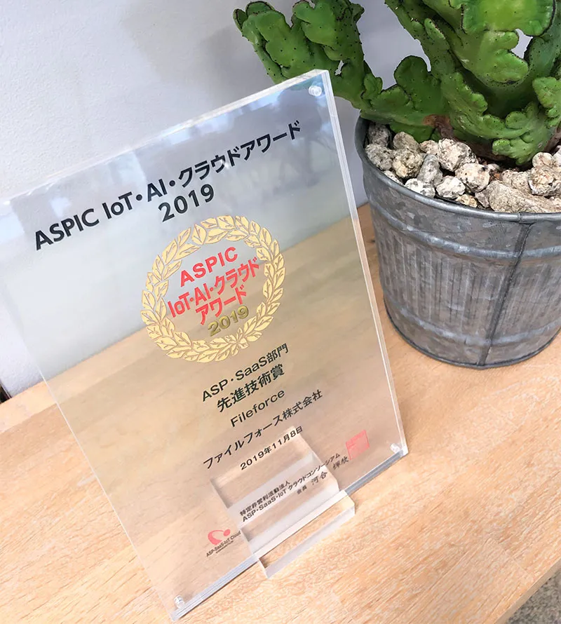 このたび、ファイルフォース株式会社の提供するクラウドファイルサービス「Fileforce」は、特定非営利法人ASP・SaaS・IoTクラウドコンソーシアム(以下ASPIC)主催の「ASPIC IoT・AI・クラウドアワード2019」の「ASP SaaS部門」において、先進的で優れた、高い技術のサービスに贈られる「先進技術賞」を受賞いたしました。