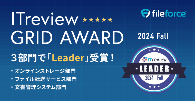 ファイルフォース株式会社(本社:東京千代田区大手町、代表取締役:サルキシャン アラム、以下「ファイルフォース」) は、アイティクラウド株式会社が運営するIT製品のレビュープラットフォーム「ITreview」(https://www.itreview.jp/ )に掲載された製品レビュー(口コミ)をもとに、顧客満足度や認知度の高い製品を表彰する「ITreview Grid Award 2024 Fall」のオンラインストレージ、ファイル転送サービス、文書管理システムの3部門で「Leader」を受賞したことをお知らせいたします。