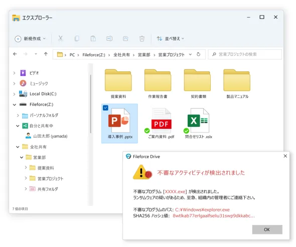 まず、予防には、前出の仮想ファイルシステムが活躍する。一般的なランサムウェアはPCなどの端末に侵入した後、OSの機能を利用してファイルを操作するための前準備を行う。しかしFileforceの仮想ファイルシステムはエクスプローラーと連携しつつ、同時にOSの機能を制御しているため、FileforceのDriveアプリへの不正なアクセスを防止できる。